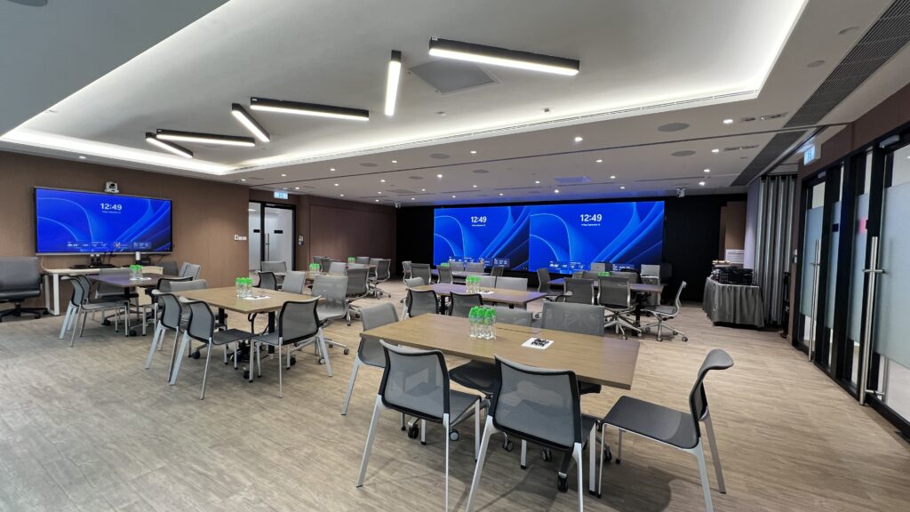 This setup features high-definition cameras, array microphones, and high-fidelity speakers, delivering exceptional audio-visual experiences. Support for both wired and wireless connections ensures seamless integration with platforms like Zoom and Teams. The high-resolution LED screens elevate presentation quality, with the dynamic LED wall enhancing visibility and engagement—key components of a modern, ESG-conscious technology deployment.